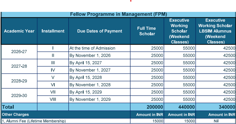 Earlier, Fellowship fees at LBSIM Delhi was ₹ 2.12 Lakhs (in 2025) for the entire course duration. This shows a fee increase of ₹ 3,000 over the year.
