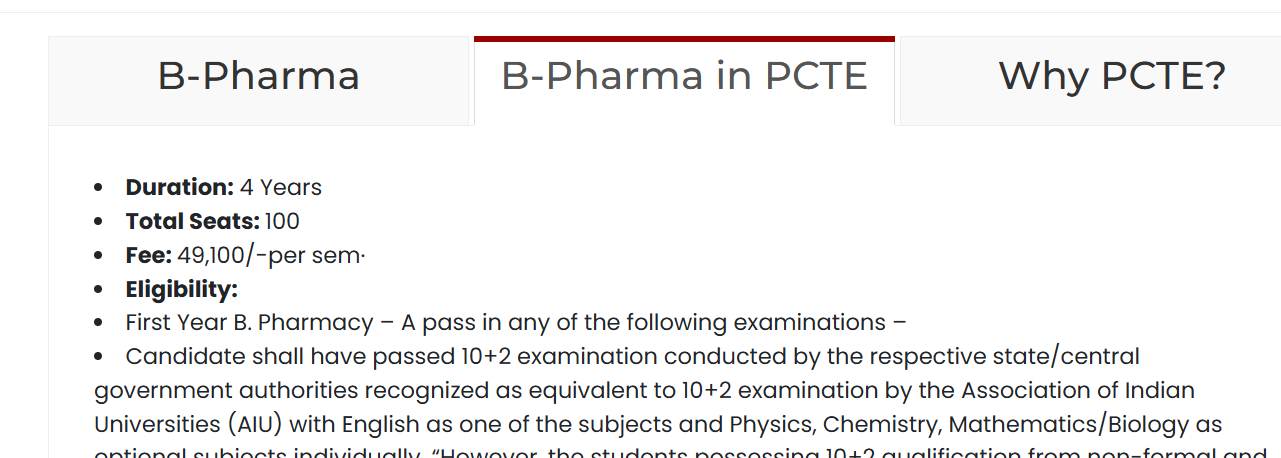 Punjab College of Technical Education Ludhiana offers a total of 100 seats for B Pharma . Candidates must have at least 10+2 to be eligible for admissions.