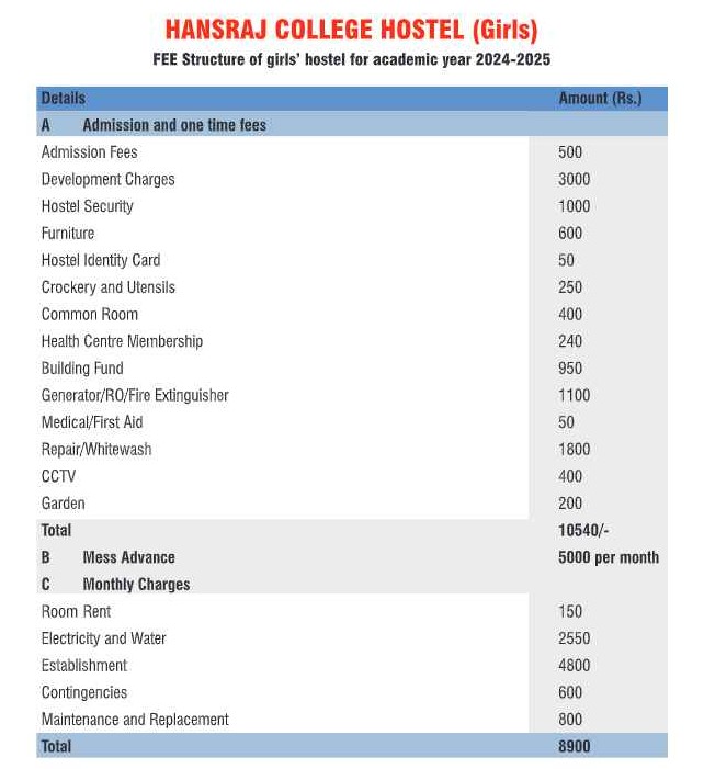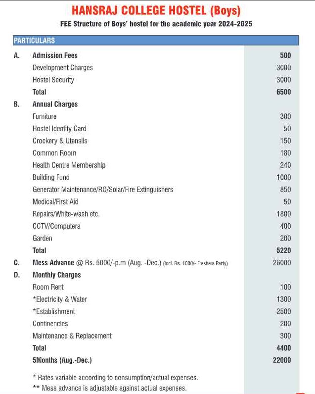 Hansraj College offers hostel facilities exclusively for boys within the campus, with a total of 200 seats available, making it highly competitive and merit-based. The annual hostel fees range from Rs. 70,000 to Rs. 80,000, which is considered affordable compared to private accommodations. Hostel rooms are shared by two students, providing basic amenities such as beds, study tables, and almirahs, but lack air conditioning. The mess offers good quality food, serving both vegetarian and non-vegetarian meals.