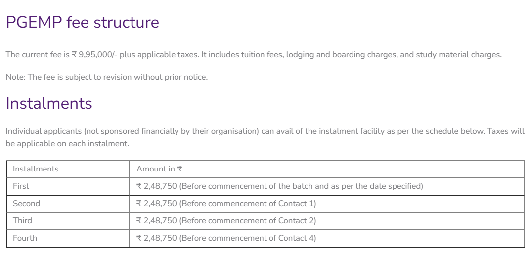 - The total fees for PGEMP is ₹ 9.95 Lakhs.