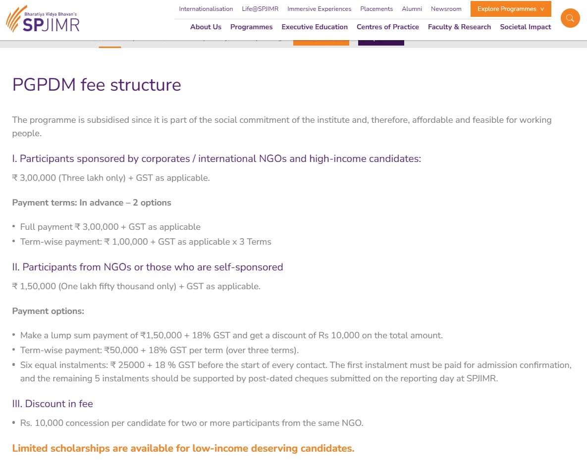 Earlier, PG Program Development Management fees at SPJIMR was ₹ 3 Lakhs (in 2025) for the entire course duration. This shows that the fee has remained unchanged since 2025.