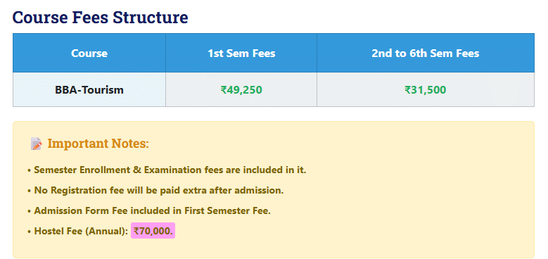 - The total fees for BBA Tourism is ₹ 2.07 Lakhs.