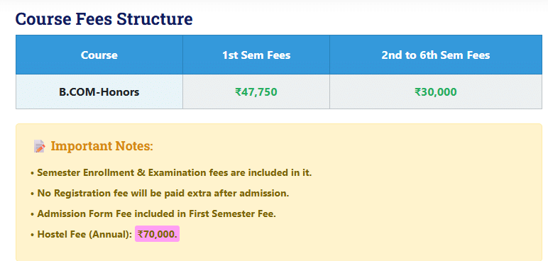 - The total fees for B.Com {Hons.} is ₹ 1.98 Lakhs.