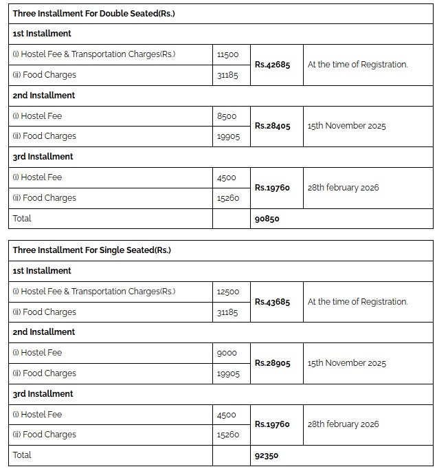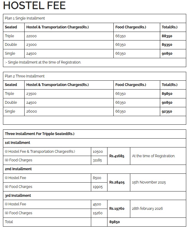 The college hostel offers a range of well-maintained facilities including Wi-Fi, library access from 8:00 a.m. to 10:00 p.m., a gym, sports room, and an open auditorium. There are three room occupancy options: single (INR 82,000/yr), double (INR 48,000/yr), and triple (INR 45,000/yr). Single rooms have attached bathrooms and amenities like a wardrobe, desk, chair, and mattress.