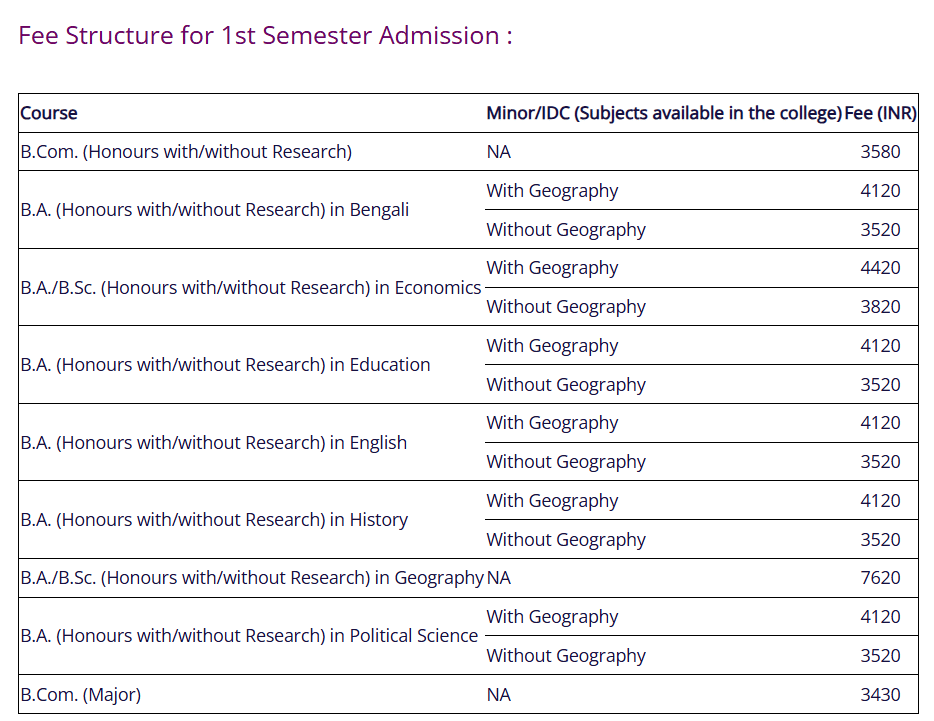 The college offers a highly affordable education with annual fees of 4,000 to 5,850 rupees, which is significantly lower than many other colleges in Kolkata. Faculty members, many of whom are alumni, are well-qualified and dedicated to student development. The college provides financial aid through scholarships like the Kanyashree program and fee concessions for low-income families, including free course books. Calcutta University supports students with additional financial schemes like the Vivekananda and Bishwa Bangla Chatra Seva scholarships.