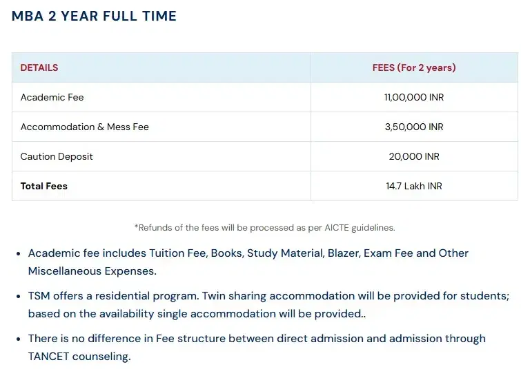 The MBA 2-year full-time program has a total fee of Rs 14.7 lakh, comprising Rs 11,00,000 as academic fee, Rs 3,50,000 for accommodation and mess, and a refundable caution deposit of Rs 20,000.