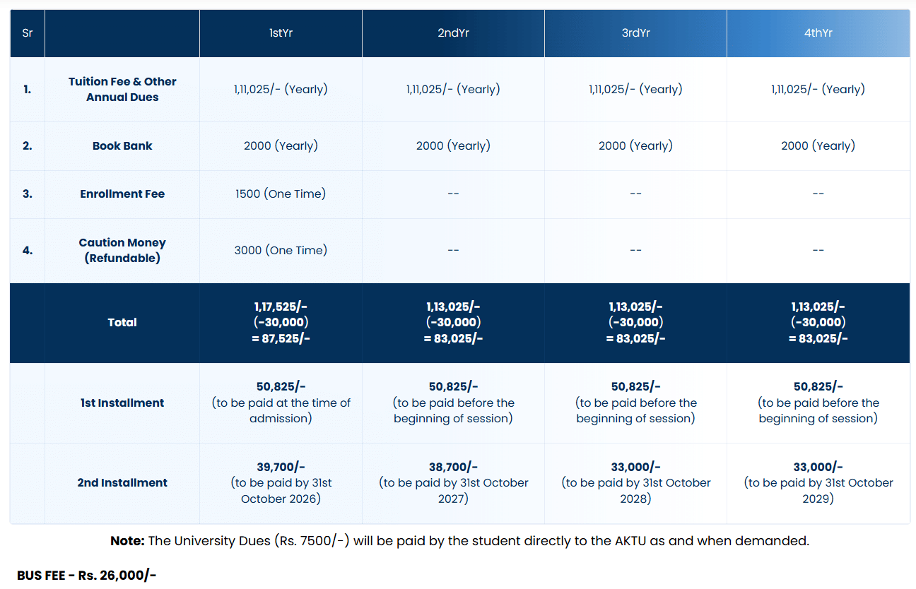 Admission to the college is based on the AKTU Entrance Exam, with college placement determined by exam rank. The faculty is highly qualified, including many with advanced degrees like M.Tech. and Ph.D., ensuring a strong academic environment. The standard tuition fee is over 100,000, but high-ranking students can obtain a fee waiver, reducing the annual cost to 23,000.