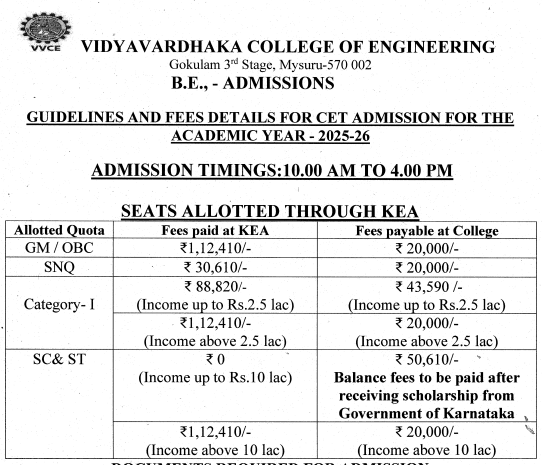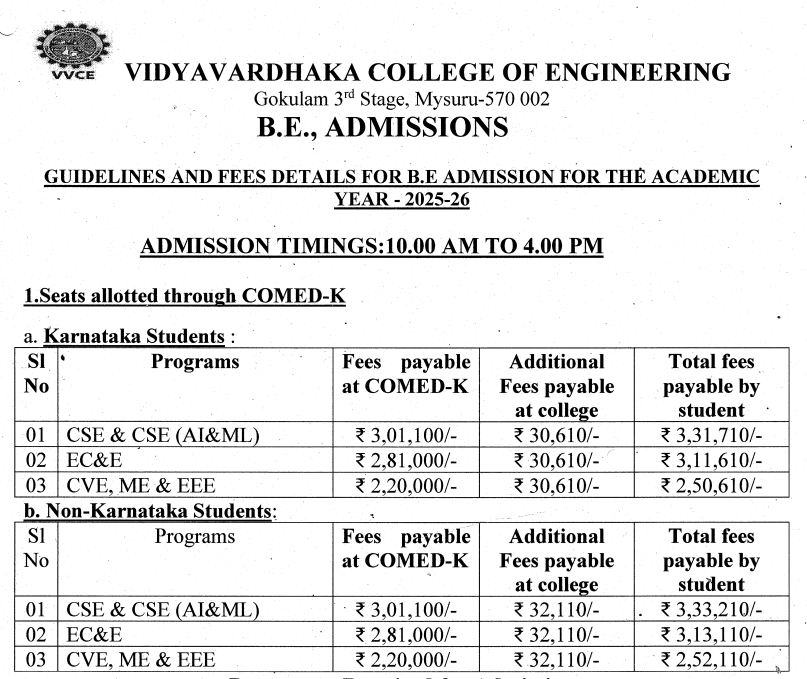 Placement success varies, with up to 90% of students securing jobs, though it sometimes drops to 40%. Placement training begins in the 4th semester, and internships, which often lead to full-time jobs, offer stipends from INR 15,000 to 40,000 monthly. Admission fees vary: Rs. 95,000 to Rs. 1,25,000 annually for KCET entrants, Rs. 2,40,000 to Rs. 3,11,000 for COMED-K, and a total of Rs. 20,00,000 for management quota. Scholarships, such as the VVCE Scholarship, provide up to Rs. 1,00,000 based on need.