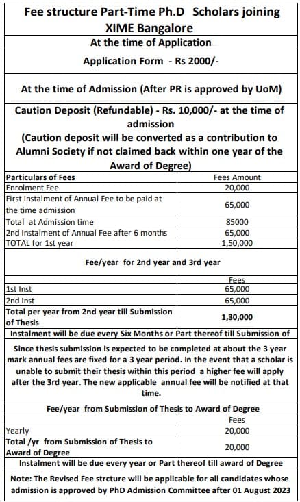 Earlier, Ph.D Management fees at XIME Bangalore was ₹ 4.1 Lakhs (in 2023) for the entire course duration. This shows a fee increase of ₹ 20,000 over the year.