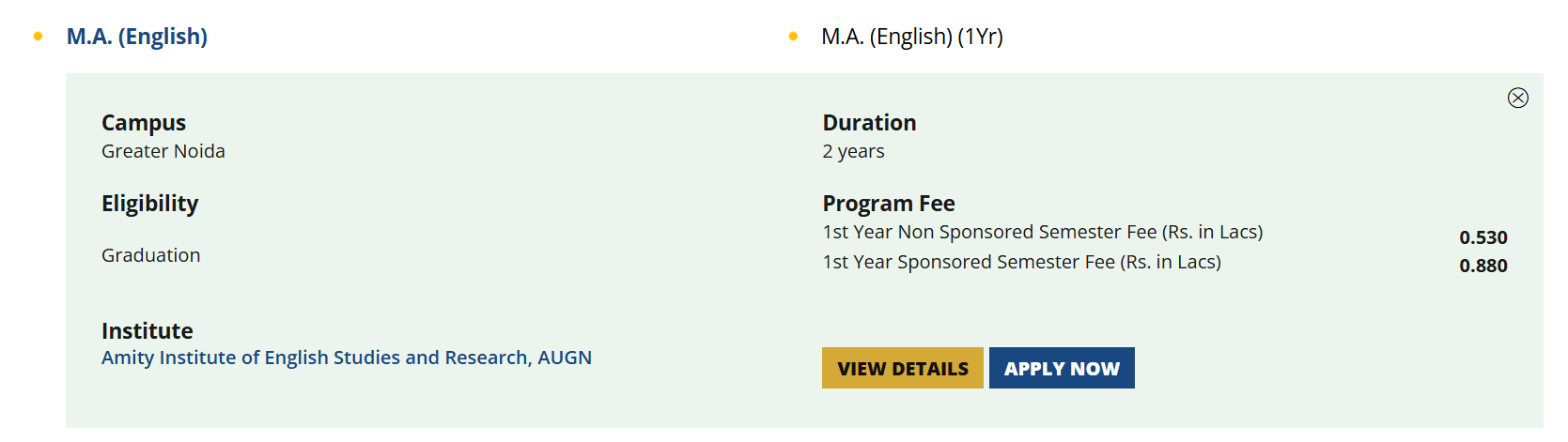 Earlier, MA English fees at Amity Institute of English and Business Communication Noida was ₹ 2.4 Lakhs (in 2020) for the entire course duration. This shows a fee decrease of ₹ 28,000 over the year.
