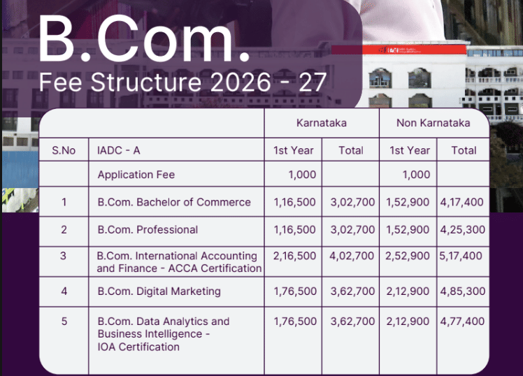 Earlier, B.Com fees at Indian Academy Degree College Bangalore was ₹ 4.1 Lakhs (in 2025) for the entire course duration. This shows a fee decrease of ₹ 7,085 over the year.