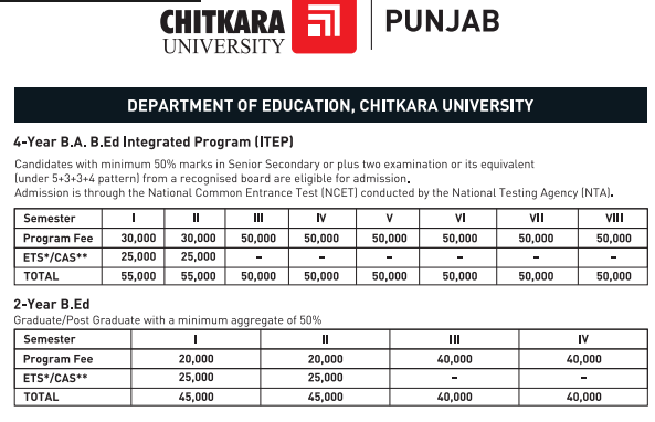 Chitkara College of Education Patiala BA + B.Ed fees 2026 is ₹ 4.1 Lakhs for the entire course duration.