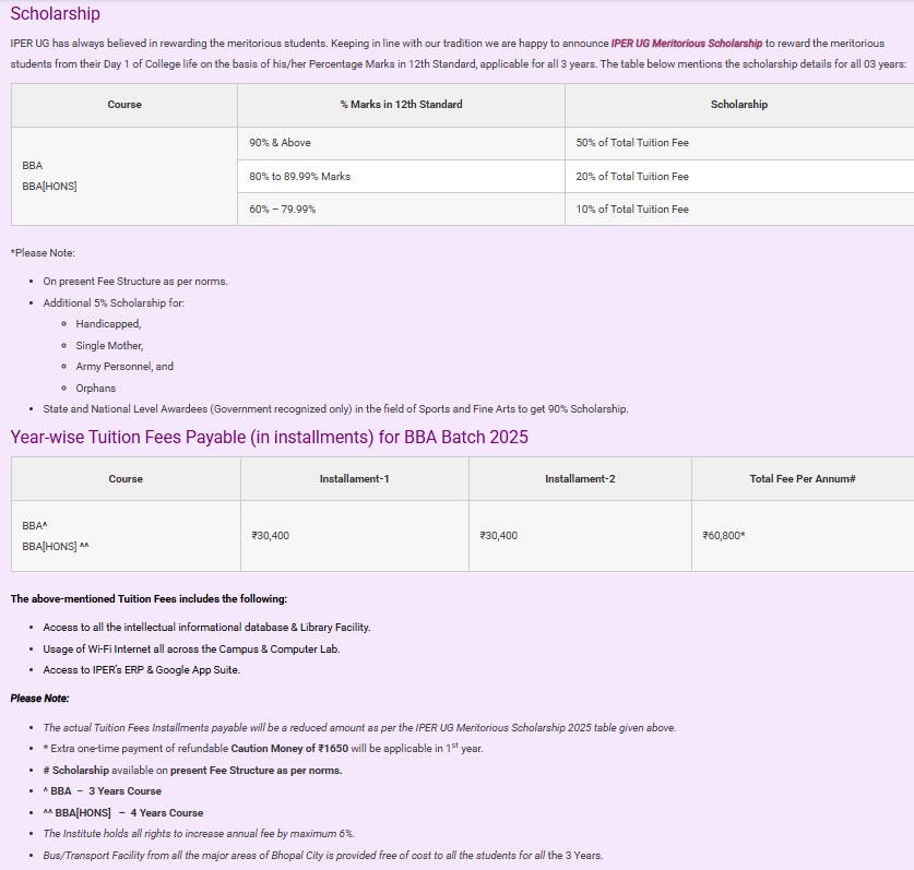 Scholarships are available based on academic performance, with reductions of up to 30% for high scorers, provided they maintain 85% attendance and 75% performance. The annual tuition for BBA is approximately 62,000 INR, including transport, with scholarships available for OBC, SC, and ST categories. The college also offers students easy access to loans through HDFC Bank. Overall, the college stands out as an affordable option with ample placement and scholarship opportunities.