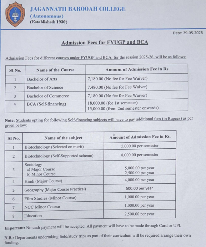 Prospective students of Jagannath Barooah College must purchase and submit an application form by the specified deadline. Admissions are based on a merit list that considers both academic performance and form submission order. Once admitted, students pay the first-semester fee of Rs. 15,000, which includes Rs. 12,000 for tuition and Rs. 3,000 for admission. For the remaining semesters, the fee is Rs. 12,000 per semester, totaling Rs. 75,000 for the entire 3-year course.