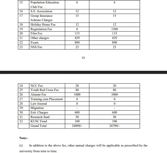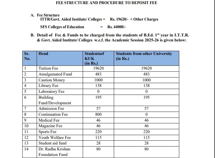 The B.Ed. 1st year fee (2025–26) is Rs. 19,620 + other charges for ITTR/Govt. Aided Colleges and Rs. 44,000 for SFS Colleges. Including tuition, caution money, library, building, admission, continuation, medical, sports, youth welfare, and other funds, the grand total comes to Rs. 26,090 for KUK students and Rs. 26,790 for students from other universities, with additional annual charges applicable as per university norms.