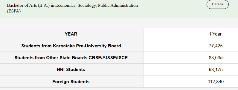 A job fair is also organized, where reputed organizations set up stalls and hire students. The annual tuition fee for students enrolled in a triple major of Public Administration, Sociology, and Economics is Rs 62,800. While the college does not offer its own scholarships or fee waivers, students can apply for scholarships through the National Scholarship Portal. Fee structures may differ for students who have completed their Pre-University Course (PUC) in Karnataka.