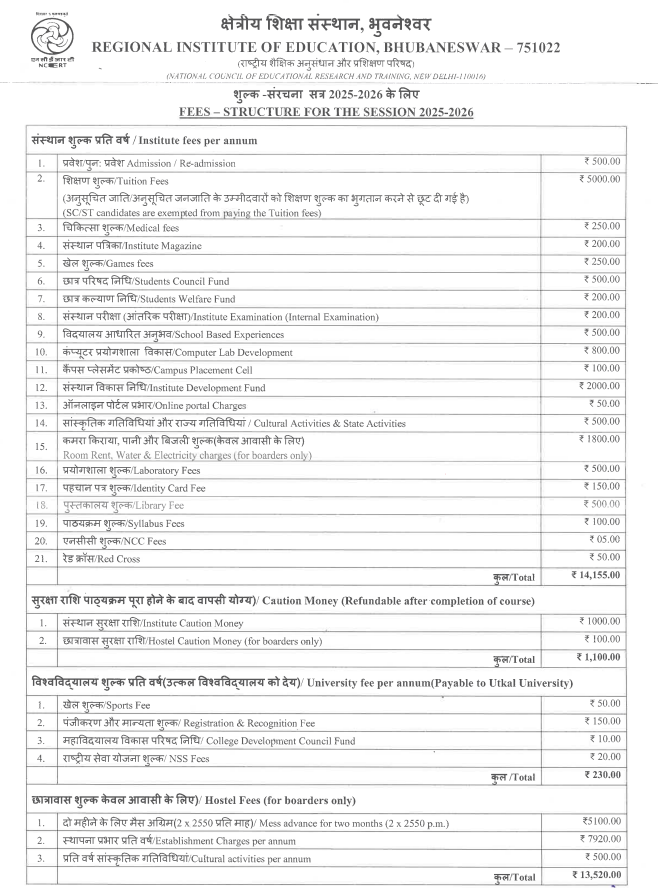 The M.Ed program at RIE Bhubaneswar requires an entrance exam for admission, with 60% of the final merit based on test scores and 40% on prior B.Ed or B.L.Ed qualifications. The faculty is known for their intelligence, experience, and supportive nature, offering extra classes for students who need them. Tuition fees are 3,500 INR yearly, with additional fees for facilities totaling 3,600 INR. Hostel fees include 6,600 INR for establishment and 500 INR for cultural activities annually, while mess fees are 2,100 INR monthly.