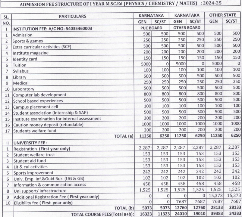 The tuition fees are Rs 26,000 for M.Sc.Ed, Rs 24,000 for B.Sc.Ed, and Ba.Bed, with hostel fees at Rs 15,000 per semester for non-Karnataka students. From the second year, the tuition fee is Rs 10,000 per semester. The institute achieves 100% placement, offering teaching jobs in schools and higher education institutions, with salary packages ranging from 4 to 20 LPA. Internships are available in the fourth year at Jawahar Navodaya Vidyalaya. Scholarships are offered by the NCERT and the Karnataka government, with amounts based on merit and income, providing 800 INR monthly for eligible students and up to 1,200 INR for postgraduates.