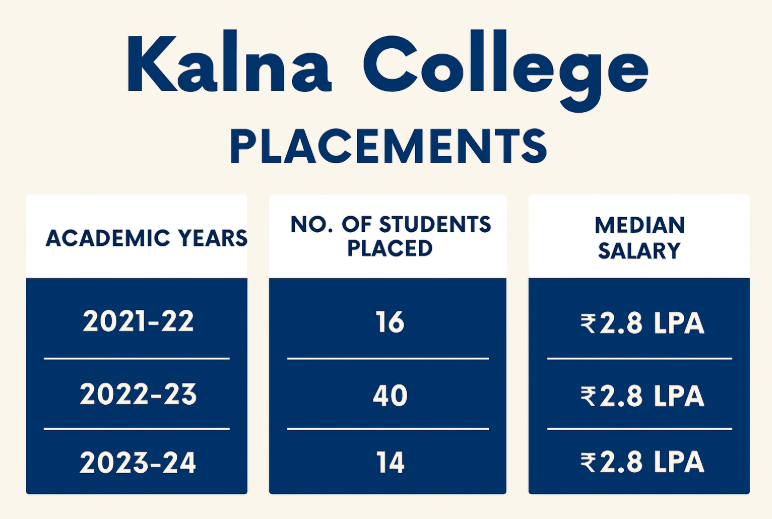 According to the 2024 placement report, the median package for UG students was INR 2.8 LPA.Out of 948 students who graduated, 14 students were placed.Top recruiters who visited Kalna College include TCS, Wipro, Infosys, and Tech Mahindra. While placement numbers are currently limited, efforts are being made to enhance opportunities for students.