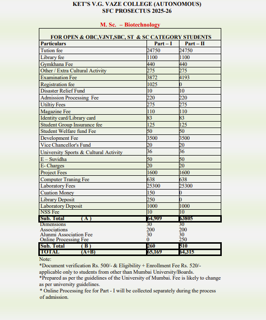 VG Vaze M.Sc Biotechnology Fee has not been released yet. For reference you can check the previous year academic fees in the section below.