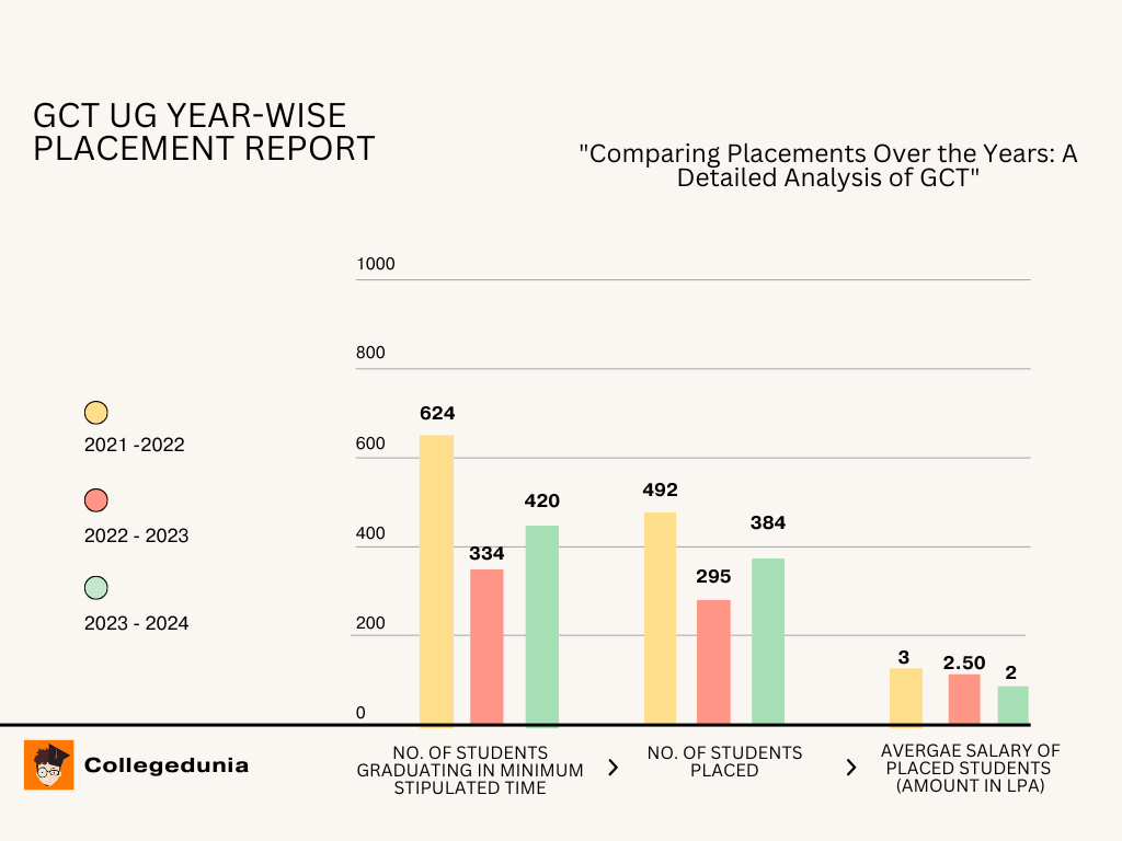 GCT placement report 2025 has not been released yet. As per the placement report 2024, a total of 728 students are graduating, while the number of placed students was 358. The average salary of the placed students was INR 4.60 LPA.