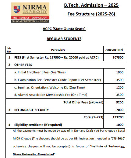 Institute of Technology, Nirma University Ahmedabad B.Tech Computer Science and Engineering Previous Fees