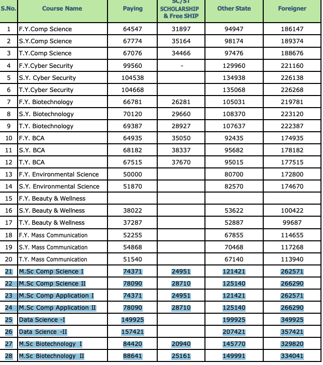 M.E.S. Abasaheb Garware College Pune M.Sc Data Science is offered as 2 Years Full Time program, with total intake of 30 seats. The minimum eligibility criteria for M.Sc is Graduation. The total fees for M.E.S. Abasaheb Garware College Pune M.Sc Data Science in 2025 is ₹ 3.07 Lakhs for the complete course duration, which includes total tuition fees of ₹ 3.07 Lakhs. Earlier, the fees in 2024 - 2025 for M.Sc Data Science was ₹ 1.68 Lakhs.