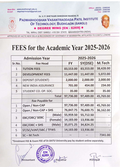 Padmabhooshan Vasantdada Patil Institute of Technology Sangli B.Tech {Lateral} Electrical Engineering fees in first year is ₹ 97,489. The detailed fees is mentioned below.Padmabhooshan Vasantdada Patil Institute of Technology Sangli Hostel Fee for Male is ₹ 15,000. Hostel Fee for Female at Padmabhooshan Vasantdada Patil Institute of Technology Sangli is ₹ 12,000 to 15,000.