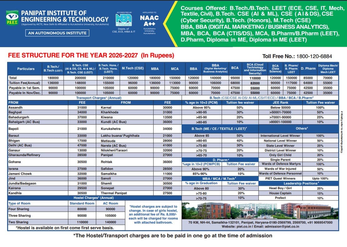 - PIET Hostel Fee is ₹ 80,000.