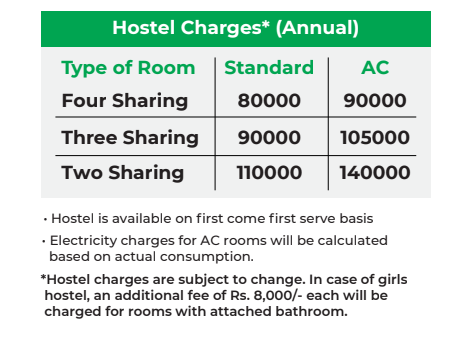 The college offers both AC and Non-AC hostel accommodations with options for 2-seater, 3-seater, and 4-seater rooms. Fees range from Rs. 60,000 to Rs. 87,000 per annum depending on the type of room selected. The hostel capacity includes facilities for approximately 150 boys and 50 girls. Facilities are generally considered good, including spacious rooms, proper sanitation, and amenities such as gym access and laundry services.