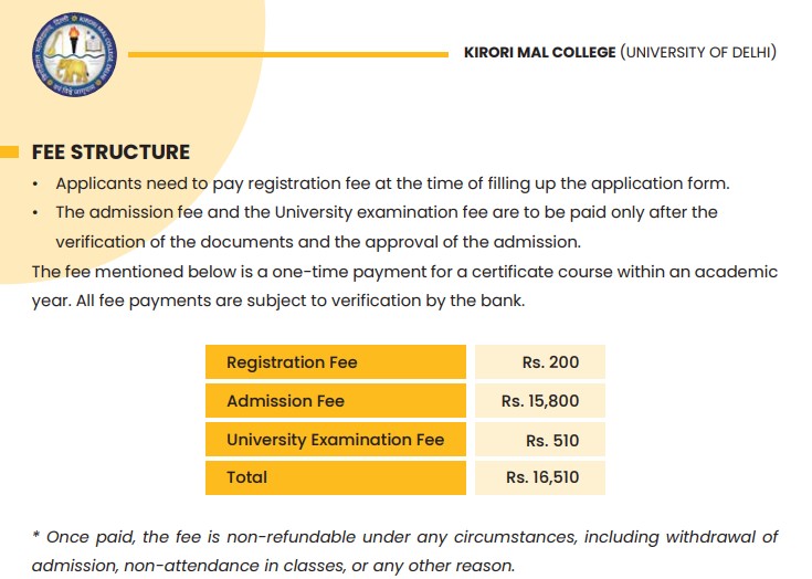 Kirori Mal College Certification French is offered as 1 Year Full Time program, with total intake of 50 seats. The minimum eligibility criteria for Certification is 10+2 with 45%. The total fees for Kirori Mal College Certification French in 2024 is ₹ 16,510 for the complete course duration.