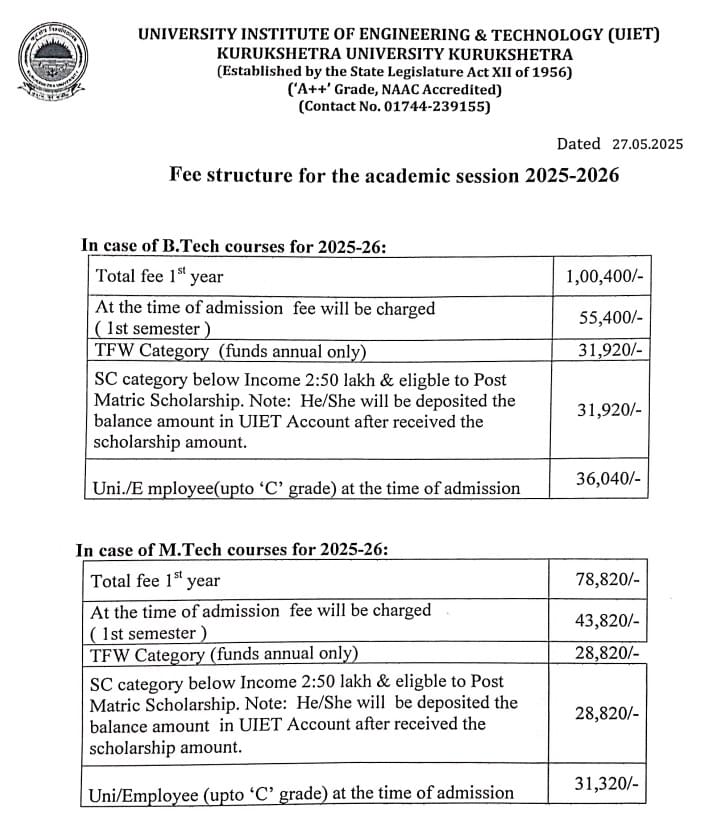 Earlier, B.Tech Computer Science and Engineering fees at UIET Kurukshetra was ₹ 3.24 Lakhs (in 2023) for the entire course duration. This shows a fee increase of ₹ 96,320 over the year.