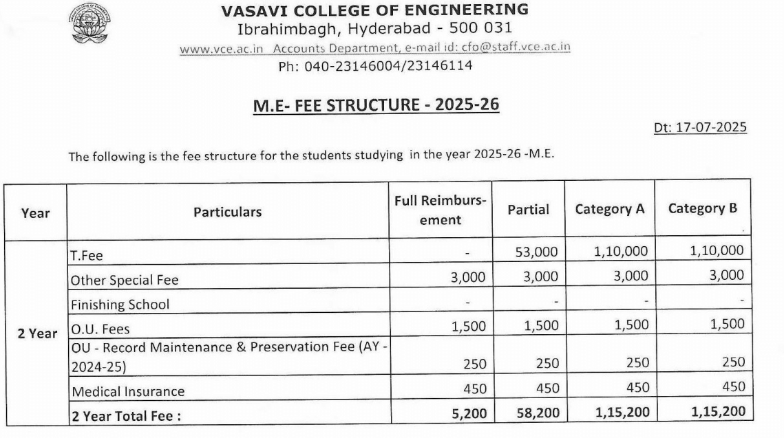 Earlier, ME Computer Science And Engineering fees at VCE was ₹ 2.32 Lakhs (in 2024) for the entire course duration. This shows a fee decrease of ₹ 1,600 over the year.