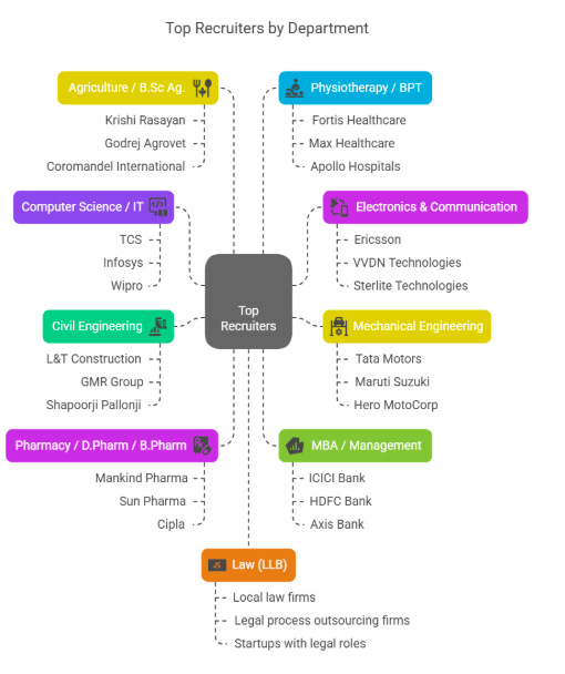 Ans. TCS, Wipro, Infosys, HCL, ICICI Bank, Tech Mahindra, and many others are some of the top recruiters. There are many mid-sized companies as well as startups participating in the placement drives in various disciplines.