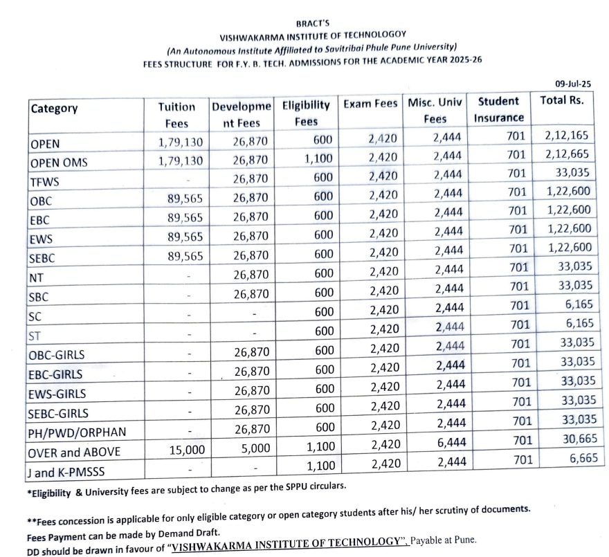 VIT Pune offers a structured admission process through the CAP rounds by DTE Maharashtra, requiring MH-CET or JEE Mains scores. The course has a robust faculty, with a 1:15 student-to-faculty ratio for undergraduates. The fees for open category students are around Rs. 1,80,000 annually, with scholarships available to reduce fees significantly. Fees are lower for OBC, EBC, SC, and ST categories, with the TFWS quota offering further reductions. The college boasts a strong placement record, especially in CSE, IT, and ECE branches, with over 80-90% placement rates and the highest packages reaching 54 LPA.