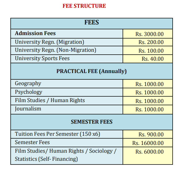 3000), tuition (Rs. 900), additional subjects (Rs. 4000), and semester fees (Rs. 15000). A placement cell, established in 2012, links students with companies like TCS, Wipro, and Deloitte, offering an average salary package of INR 1-2 lakh per annum and a rare high of INR 8 lakh. Students often pursue further studies to enhance job prospects, particularly in fields like teaching and journalism. Internships are available but limited. Scholarship opportunities are provided based on academic performance and financial need, subject to specific conditions.