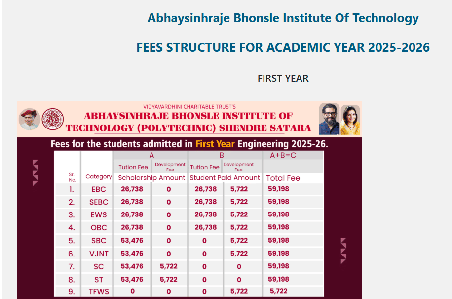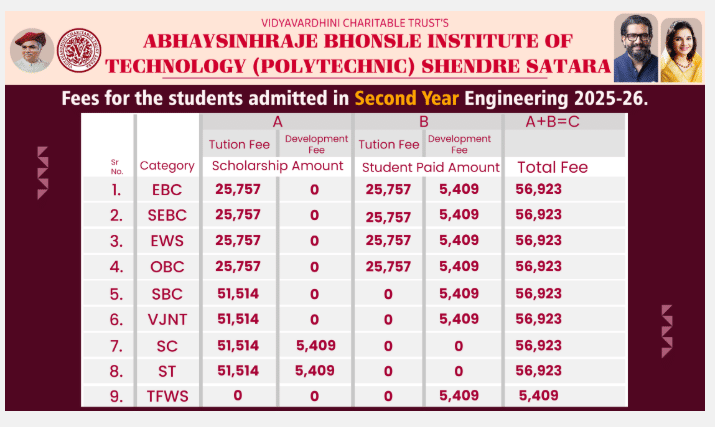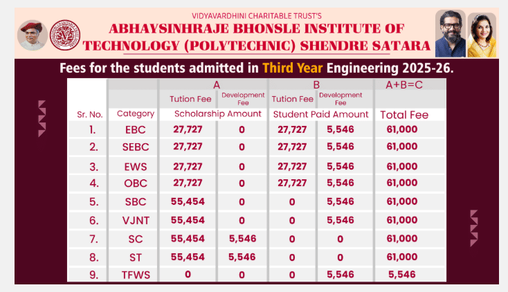 Abhaysinhraje Bhonsle Institute of Technology Satara Polytechnic Information Technology is offered as 3 Years Full Time program. The minimum eligibility criteria for Polytechnic is 10th. The total fees for Abhaysinhraje Bhonsle Institute of Technology Satara Polytechnic Information Technology in 2025 is ₹ 1.77 Lakhs for the complete course duration, which includes total tuition fees of ₹ 1.77 Lakhs. Earlier, the fees in 2023 - 2024 for Polytechnic Information Technology was ₹ 1.77 Lakhs.