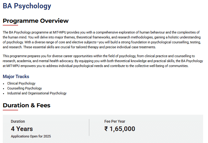 MITWPU Faculty of Liberal Arts Pune BA Psychology is offered as 3 Years Full Time program, with total intake of 120 seats. The minimum eligibility criteria for BA is 10+2 with 50%. The total fees for MITWPU Faculty of Liberal Arts Pune BA Psychology in 2026 is ₹ 6.6 Lakhs for the complete course duration, which includes total tuition fees of ₹ 6.6 Lakhs. Earlier, the fees in 2025 - 2026 for BA Psychology was ₹ 4.95 Lakhs.