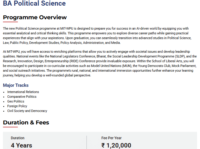 MITWPU Faculty of Liberal Arts Pune BA Political Science is offered as 3 Years Full Time program, with total intake of 30 seats. The minimum eligibility criteria for BA is 10+2 with 50%. The total fees for MITWPU Faculty of Liberal Arts Pune BA Political Science in 2026 is ₹ 4.8 Lakhs for the complete course duration, which includes total tuition fees of ₹ 4.8 Lakhs. Earlier, the fees in 2025 - 2026 for BA Political Science was ₹ 3.6 Lakhs.