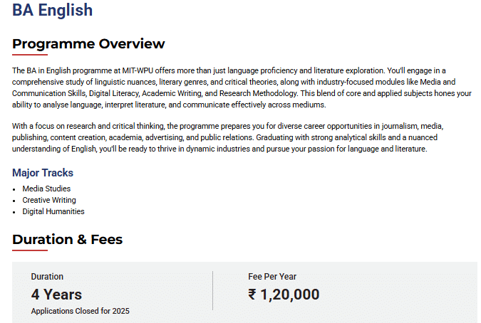 MITWPU Faculty of Liberal Arts Pune BA English is offered as 3 Years Full Time program, with total intake of 30 seats. The minimum eligibility criteria for BA is 10+2 with 50%. The total fees for MITWPU Faculty of Liberal Arts Pune BA English in 2026 is ₹ 4.8 Lakhs for the complete course duration, which includes total tuition fees of ₹ 4.8 Lakhs. Earlier, the fees in 2025 - 2026 for BA English was ₹ 3.6 Lakhs.
