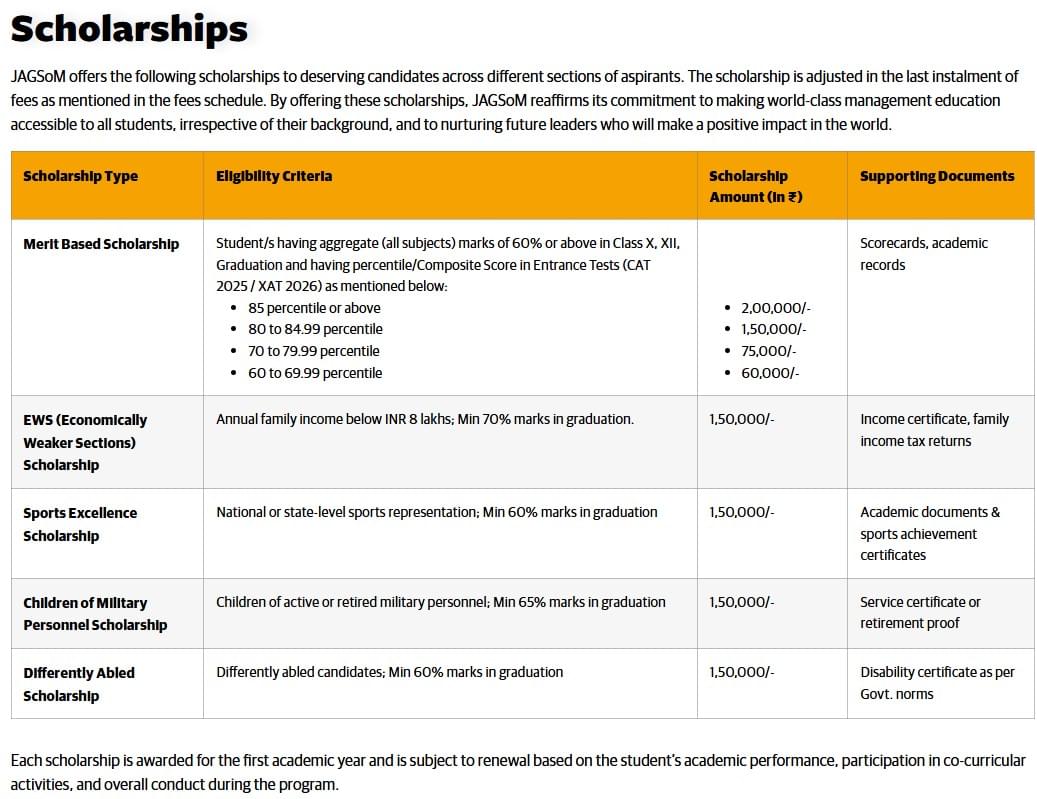 JAGSoM encourages innovation and entrepreneurship, supporting students with startup ideas. The total fee for the PGDM program is approximately 15.9 lakh INR, including boarding, lodging, and food. Scholarships are available, such as the General Scholarship offering 4 lakh INR to 30 students, and the EWS Scholarship providing a full 14 lakh INR to 10 students, based on academic performance and JAGMAT scores. JAGSoM also facilitates education loans through banks and ensures campus job opportunities through work-study programs, with an average salary package of 13 lakh INR.