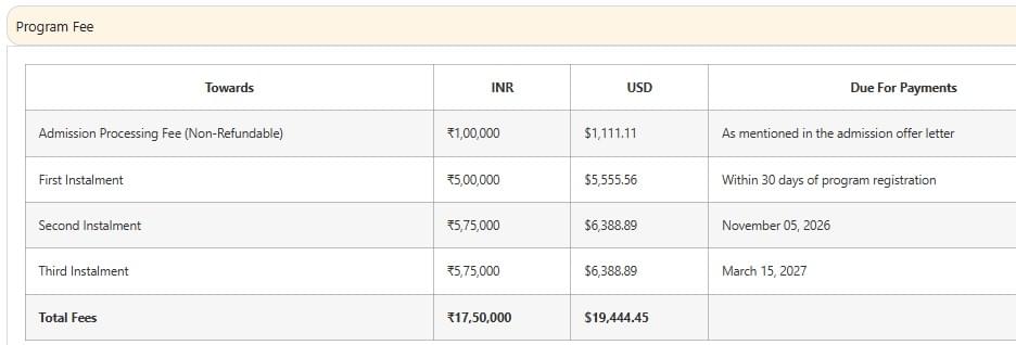 The Total Program Fee is 17,50,000 INR or $19,444.45 USD. This total is broken down into four payments. The first payment is a non-refundable Admission Processing Fee of 1,00,000 INR (or $1,111.11 USD), which is due as mentioned in your admission offer letter. Following that, there are three installments. The First Instalment of 5,00,000 INR ($5,555.56 USD) is due within 30 days of program registration. The Second Instalment of 5,75,000 INR ($6,388.89 USD) is due on November 05, 2026. Finally, the Third Instalment, also 5,75,000 INR ($6,388.89 USD), is due on March 15, 2027.