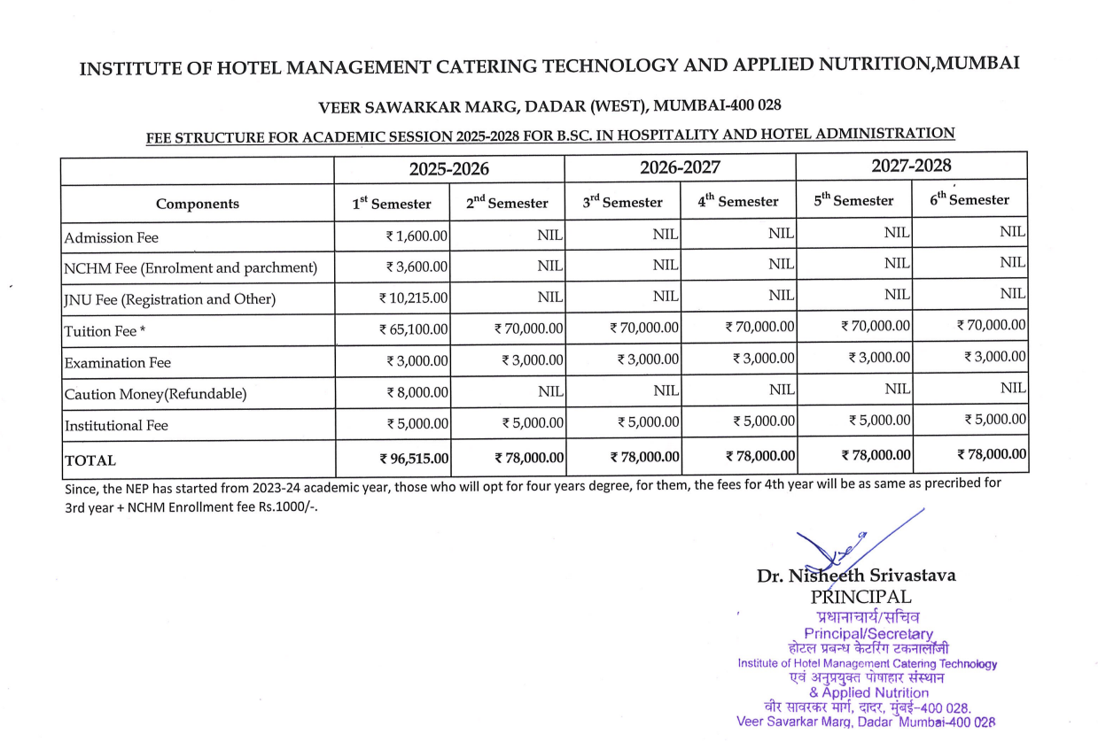 Earlier, B.Sc(HHA) Hospitality And Hotel Administration fees at IHM Mumbai was ₹ 4.87 Lakhs (in 2024) for the entire course duration. This shows that the fee has remained unchanged since 2024.