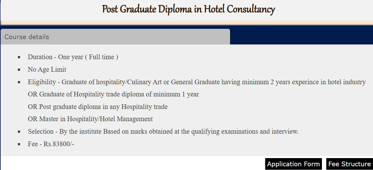 Students have an option to pursue PG Diploma Hotel Management from similar colleges such as IHM Mumbai, Institute of Hotel Management Catering Technology and Applied Nutrition Chennai. Similar to IHM Mumbai, PG Diploma Hotel Management at these group colleges is offered Full Time for a duration of 1 Year.
