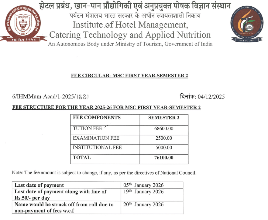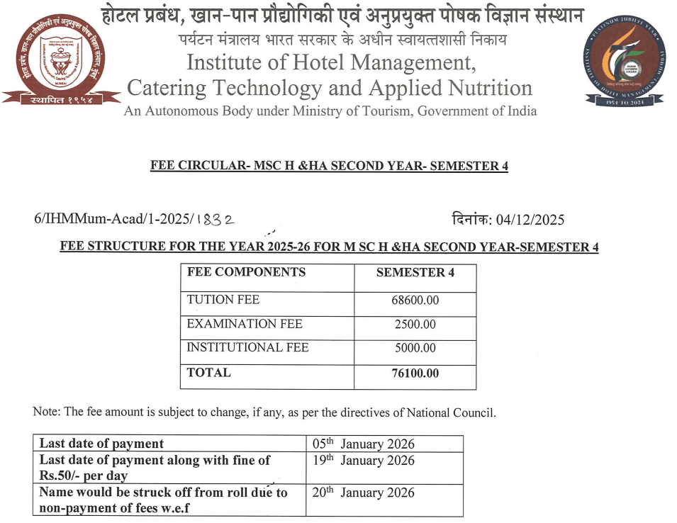 Earlier, M.Sc(HA) Hospitality Administration fees at IHM Mumbai was ₹ 3.13 Lakhs (in 2024) for the entire course duration. This shows a fee decrease of ₹ 8,715 over the year.
