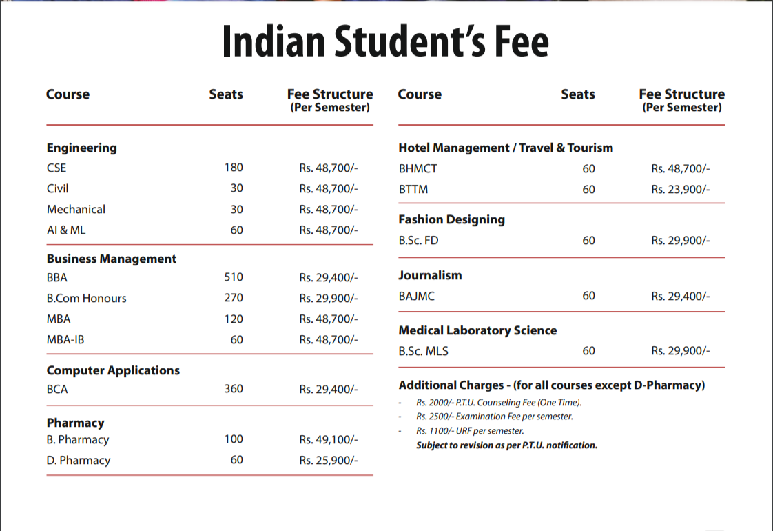 25 Feb, 2026 PCTE Group of Institutes Ludhiana has released the Fee structure 2026-27 for B.Sc Fashion Design programs. The total academic fee is ₹ 2.03 Lakhs.