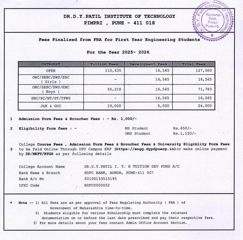 Dr. D.Y. Patil Vidya Pratishthan Society's Pune BE Mechanical Engineering fees in first year is ₹ 1.04 Lakhs. The detailed fees is mentioned below.Dr. D.Y. Patil Vidya Pratishthan Society's Pune offers a total of 180 seats for BE Mechanical Engineering.