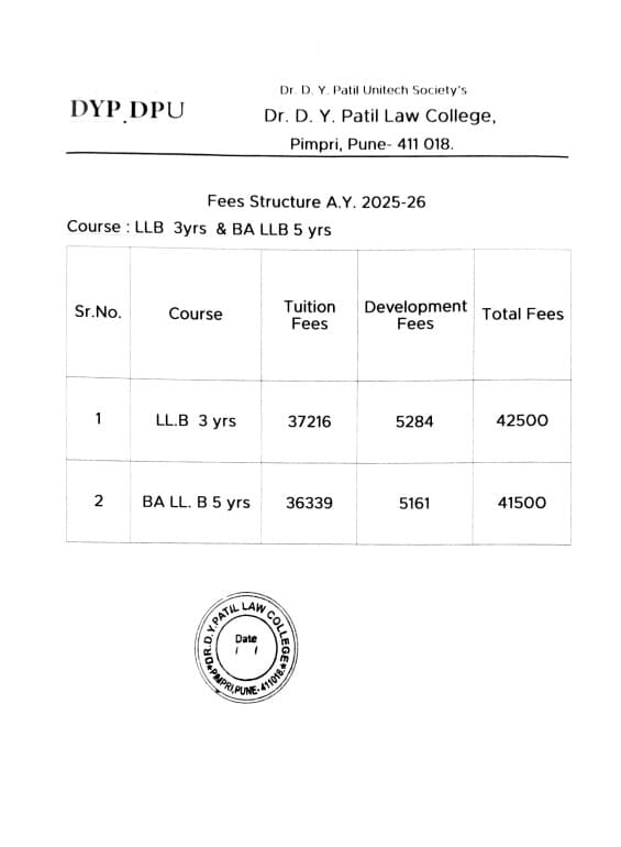 Dr. D.Y. Patil Vidya Pratishthan Society's Pune L.L.B is offered as 3 Years Full Time program. The minimum eligibility criteria for L.L.B is Graduation with 45%. The total fees for Dr. D.Y. Patil Vidya Pratishthan Society's Pune L.L.B in 2023 is ₹ 87,000 for the complete course duration, which includes total tuition fees of ₹ 77,679.