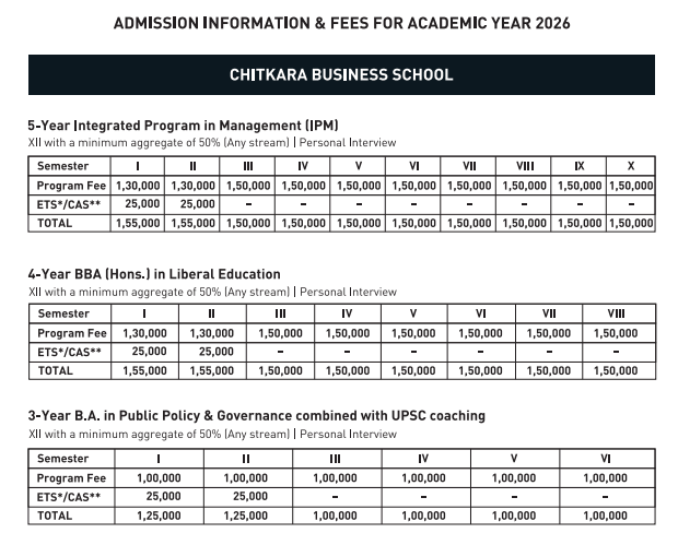 07 Feb, 2026 Chitkara University, Chitkara Business School Patiala Fee Structure 2026 has been released for BA Public Policy programs. The total academic fee is ₹ 6.5 Lakhs.
