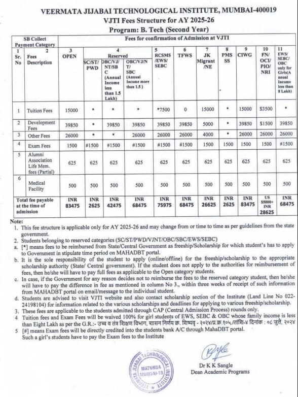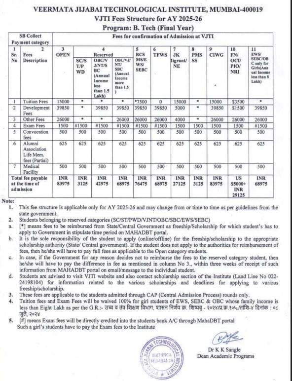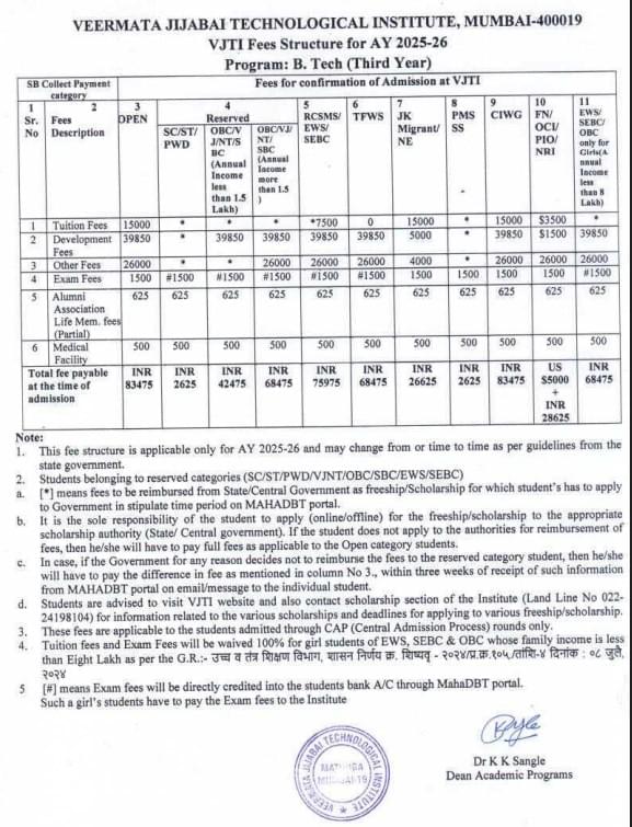Admission to VJTI is conducted through a four-round CAP allotment process, where applicants can select from about 40 colleges. The faculty, primarily PhD graduates, offer excellent teaching and career guidance. The college is government-funded, making its fees affordable. The annual tuition for general category engineering students is around Rs. 80,000 to Rs. 85,000, significantly lower than private institutions. Fees vary by category: OBC/VJ/NT/SBC students with income over Rs. 1.5-8 lakh pay Rs. 67,850, those below Rs. 1.5 lakh pay Rs. 41,850, SC/ST/PWD students pay Rs. 2,000, EWS/SEBC students pay Rs. 75,350, and TFWS students pay Rs. 67,850.